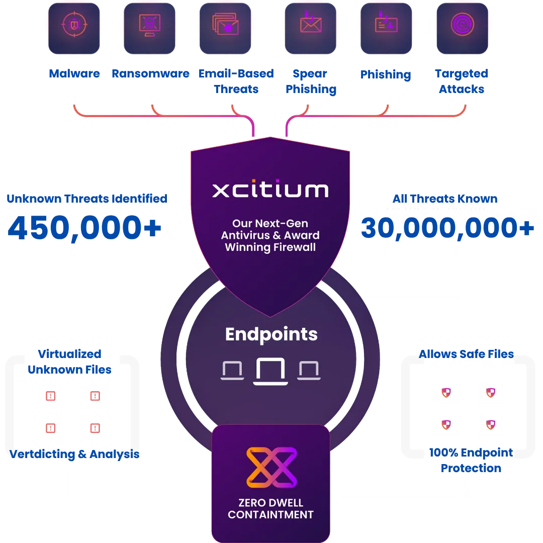Xcitium is a next-generation endpoint security platform that stops threats before they execute. Using ZeroDwell Containment, it instantly isolates unknown files, preventing attacks without disrupting users.